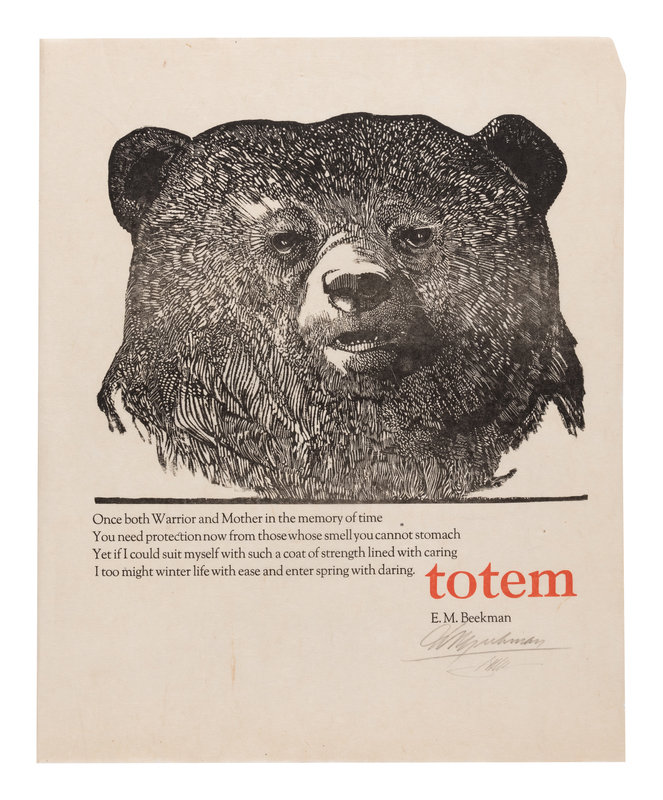 BEEKMAN, E. M. Totem. [Easthampton, MA:] Pennyroyal Press, 1973. Broadside, 297 x 344 mm. Illustrated with two wood engravings by Moser. LIMITED EDITION, one of 130 copies, signed by both Beekman and Moser. Pennyroyal Checklist [B]22. — BEEKMAN, E. M. Totem. [Northhampton, MA: Pennyroyal Press, 1976]. Broadside, 442 x 365 mm. Illustrated with a large wood engraving of a bear above Beekman’s ode to bears. LIMITED EDITION, one of 100 copies, signed by both Beekman and Moser. Accompanied by another copy of the broadside printed on Japan paper, signed by both; a proof copy of the woodcut (without text), signed by Moser; and 2 mock-up proofs incorporating newsprint with annotations by Moser. Pennyroyal Checklist [B]32.