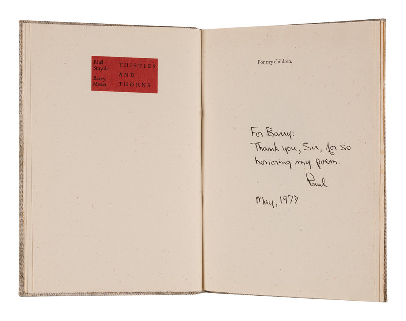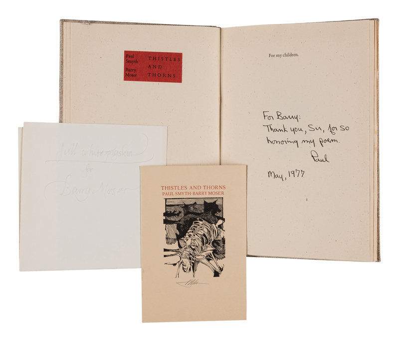 LIMITED EDITION, copy number 1 of 253 copies, SIGNED BY SMYTH AND MOSER. PRESENTATION COPY, inscribed by the author to Moser on the dedication page: “For Barry: Thank you, Sir, for so honoring my poem. / Paul / May 1977”. With a promotional pamphlet signed by Moser laid in. Pennyroyal Checklist [M]4.