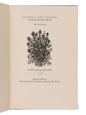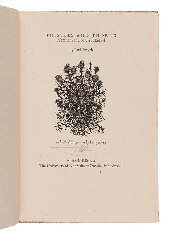 [MOSER, Barry, illustrator]. SMYTH, Paul (1944-2006). Thistles and Thorns: Abraham and Sarah at Bethel. Omaha: Printed by Harry Duncan at Abattoir Editions / University of Nebraska, 1977.
