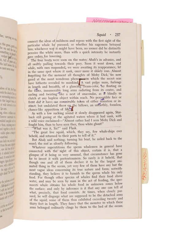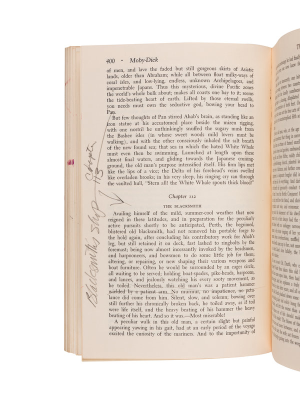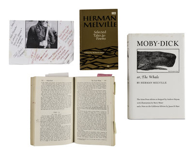 BARRY MOSER’S HEAVILY ANNOTATED COPY, with his markings, underlinings and notes in pencil and ink throughout indicating many of his references for the subjects of his illustrations for the monumental Arion Press edition (1979), with inserted slips and notes, etc. Some annotations adding instructions to himself, such as: “vertical images - never wider than 17 picas.” On the final blank he quotes Melville’s Fossil Whale and book analogy (Chapter 14): “To produce a mighty book, you must choose a mighty theme. No great and enduring volume can ever be written on the flea, though may there who have tried it. Ch. 104”. Accompanied by Moser’s copy of a trade edition of the University of California reprint of Arion Press edition, small 4to, original cloth, in dust jacket; and his copy of Herman Melville. Selected Tales & Poems. Edited by Richard Chase. New York, [1965]. Later paperback edition.