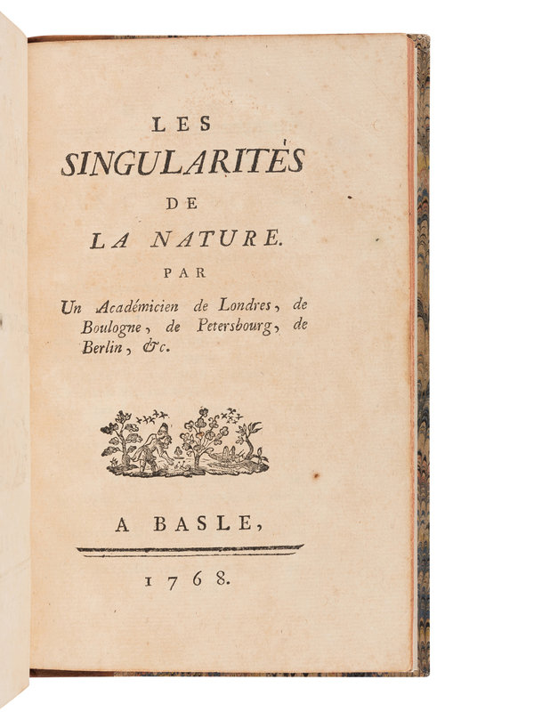 VOLTAIRE, François Marie Arouet de (1694-1778). Les Singularitès de la Nature. Paris or Geneva: [Cramer], 1768. 8vo (190 x 118 mm). Woodcut on title-page. (Light toning or occasional staining.) Modern quarter calf, marbled boards, spine gilt, red morocco lettering-piece gilt, edges stained red (some minor rubbing). FIRST EDITION, FIRST ISSUE of Voltaire’s work containing his observations of natural history, science, law, medicine, philosophy, and religion. Cioranescu 64840.