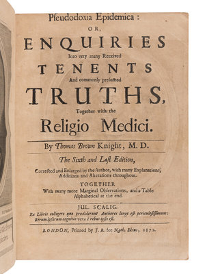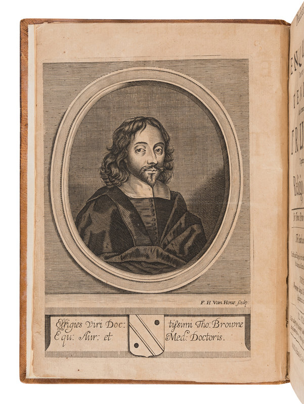 BROWNE, Thomas, Sir (1605-1682). Pseudodoxia Epidemica: Or, Enquiries into very many Received Tenents and commonly presumed Truths, Together with the Religio Medici Together with many more Marginal Observations, and a Table Alphabetical at the end. London: Printed by J.R. for Nath. Ekins, 1672. 4to ( 222 x 162 mm). Engraved portrait frontispiece, woodcut initials and headpieces. (Some browning or light offsetting.) Later roan gilt, spine gilt(front joint repaired, some rubbing). Sixth and last edition of Browne’s popular work, corrected and enlarged with additional explanations, in which he refutes superstitious contemporary beliefs based on empirical observations in line with the Baconian method. The work is organized into books based on the renaissance scale of creation: mineral, vegetable, animal, man art, geography and history, and astronomy and the cosmos. Keynes 79; Wing B5165.