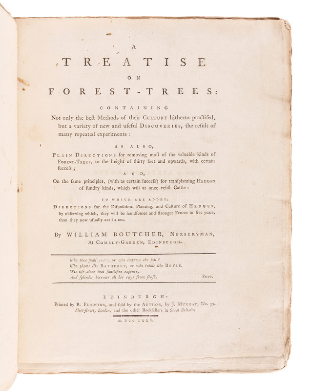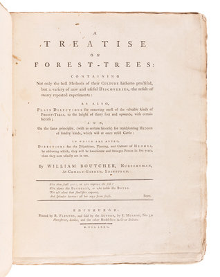 BOUTCHER, William (fl. 1734-1781). A Treatise on Forest-Trees: Containing not only the Best Methods of their Culture hitherto Practiced, but a Variety of New and Useful Discoveries. Edinburgh: R. Fleming for J. Murray, 1775.