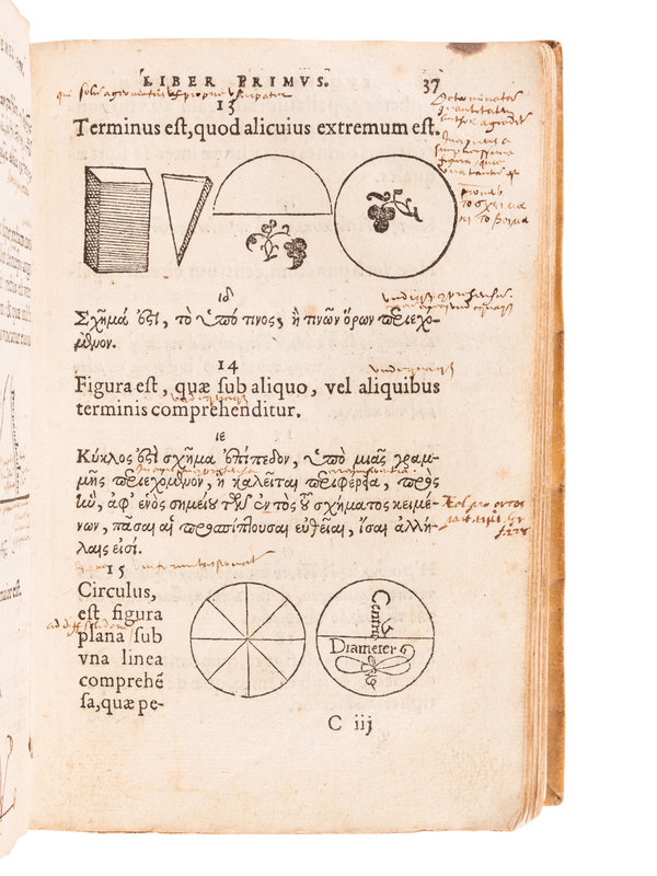 8vo (164 x 104 mm). Woodcut device on title-page, woodcut printer's device at end; text in Greek and Latin; woodcut diagrams throughout. (Some minor browning or spotting, inkburn to the upper margin of a few leaves.) Contemporary vellum, yapp edges, hand-lettered on spine (lacking ties, soiled); quarter morocco folding case. Provenance: extensive early mostly marginal ink notes and diagrams.