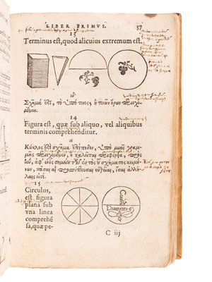 EUCLID (fl. ca 300 B.C.). Euclidis Elementorum libri XV Graece & Latine... Paris: Apud Hieronymum de Marnef & Guillaume Cavellat, 1537.