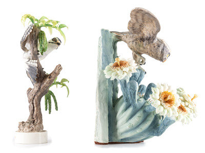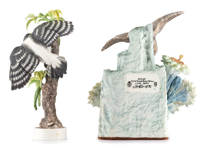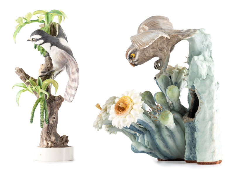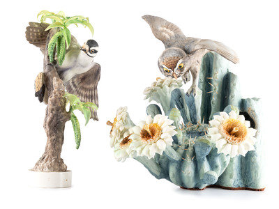 A Dorothy Doughty for Royal Worcester Porcelain Cactus Owl and Downey Woodpecker