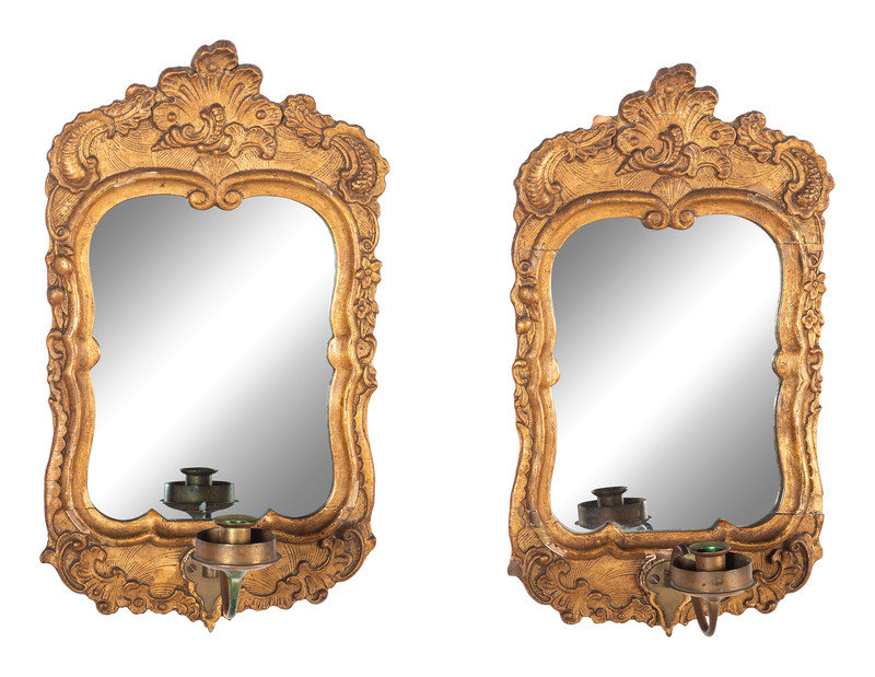 A Pair of Dutch Classical Carved and Gilt Wood One-Light Wall Sconces