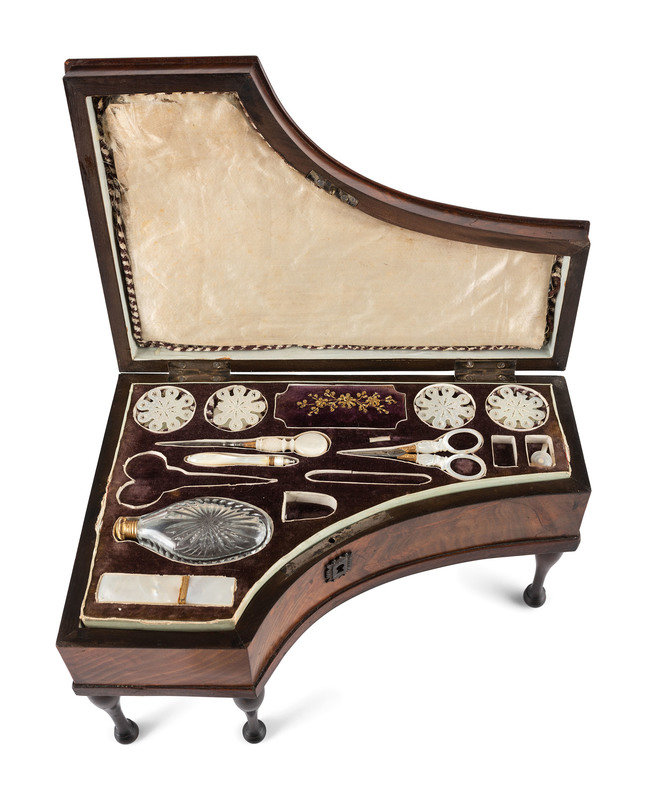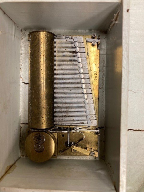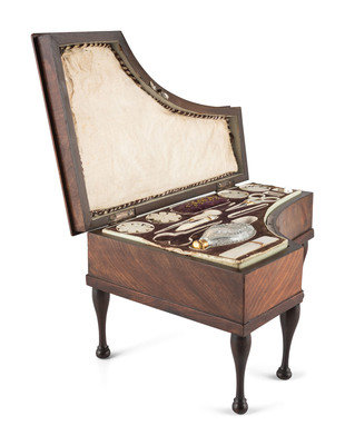 with removeable tray of mother-of-pearl vanity items over a cylinder music box.