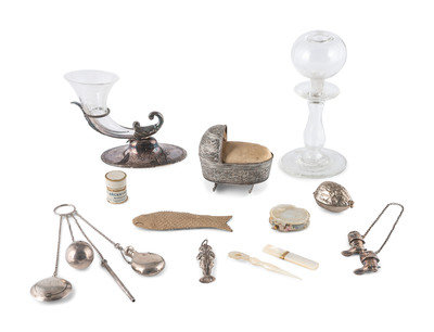 including a chatelaine, pin cushions, and an 18K gold thimble, among other items.
