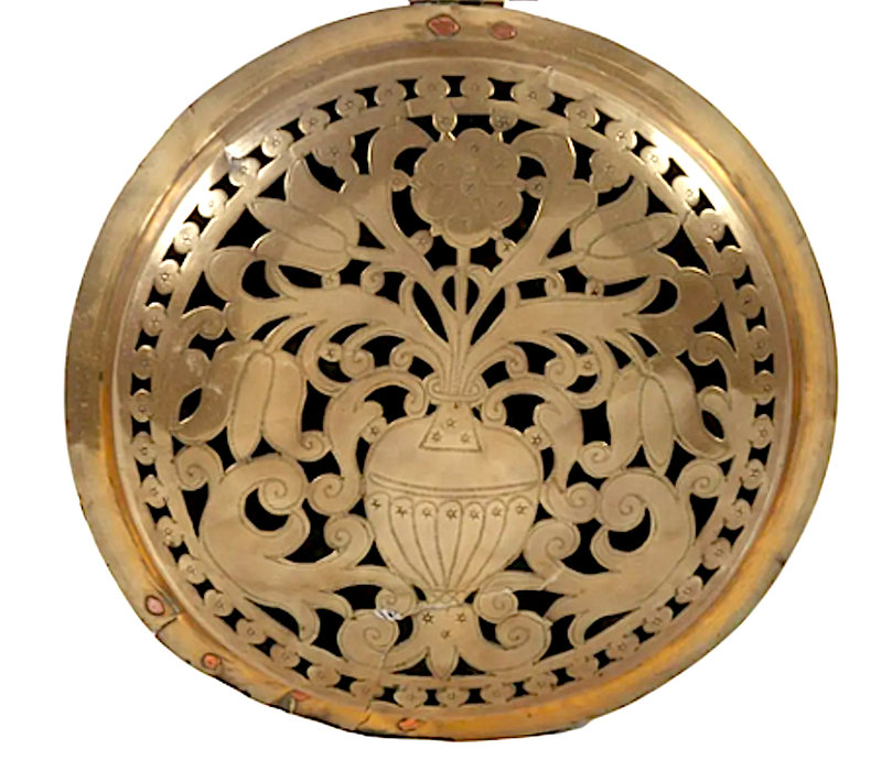 Pierced and engraved lid with tulip and vase design is reminiscent of 17th cent English "Blue dash" delftwares.