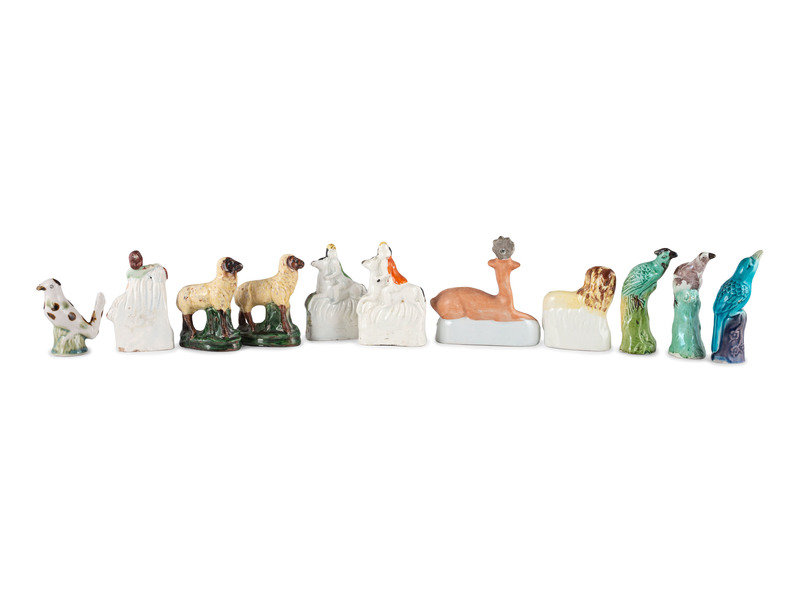 comprising two earthenware riders with hounds, a recumbent deer, a girl with a spaniel, a lion, a bird whistle, two redware sheep marked Turtlecreek Potters, and three perched birds