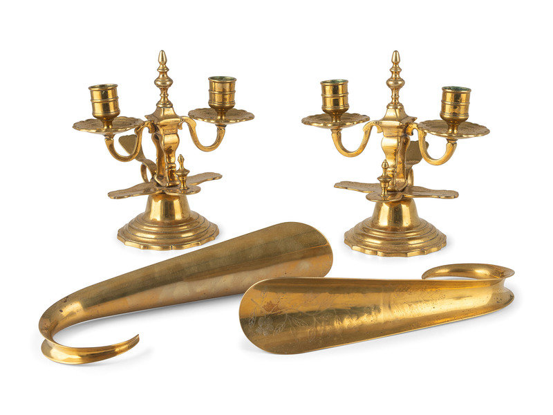 A Pair of Brass Two-Light Candelabra, a Pair of Shoe Horns and Other Brass Articles