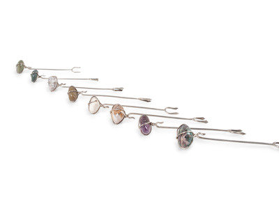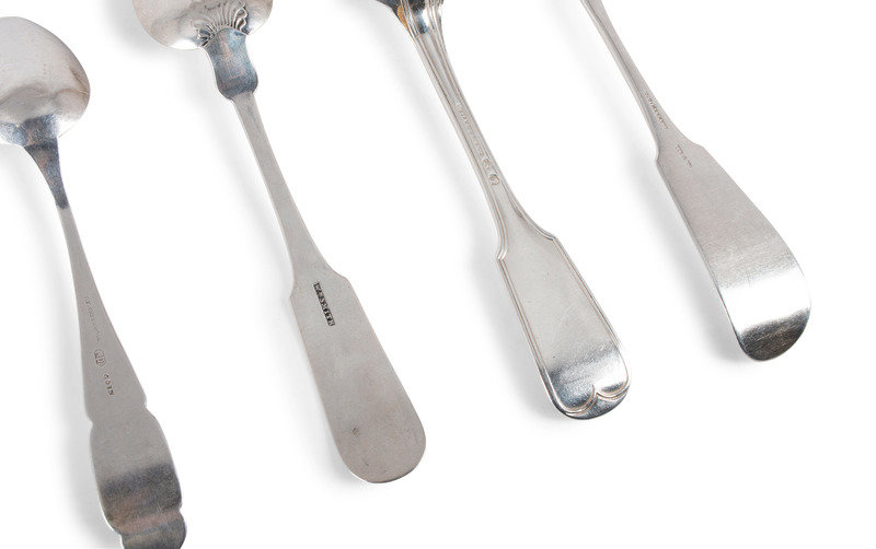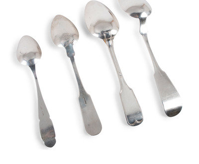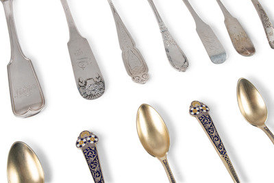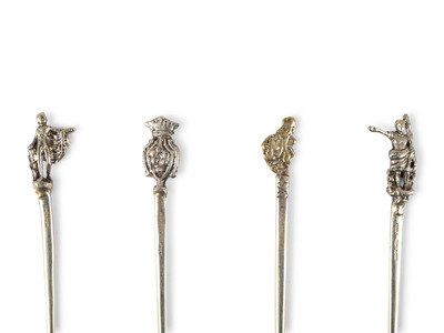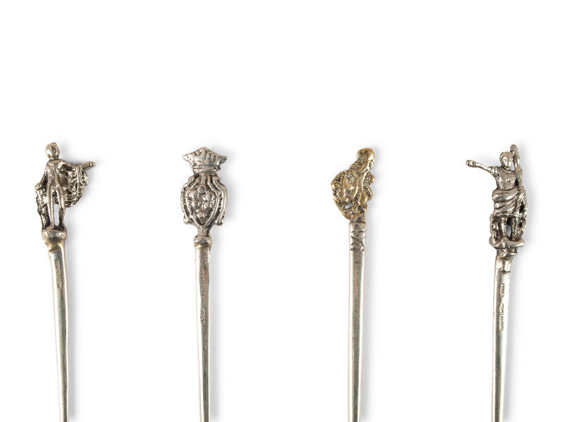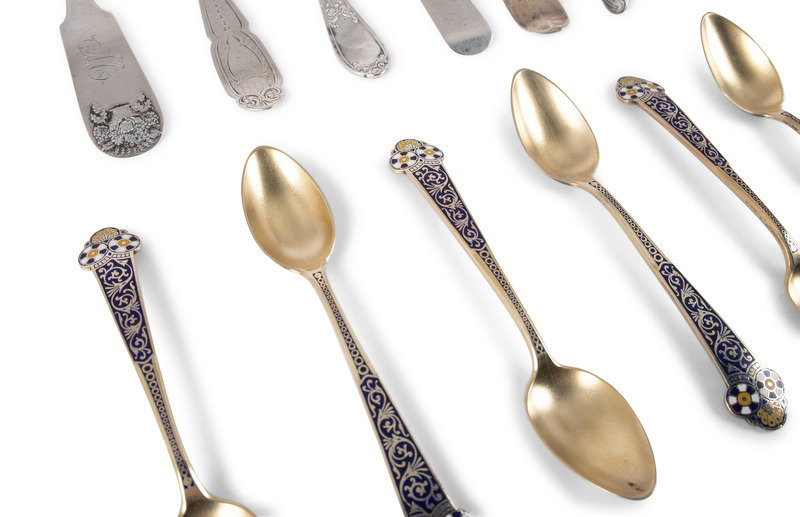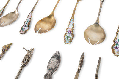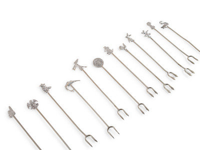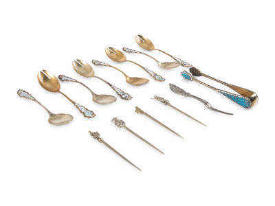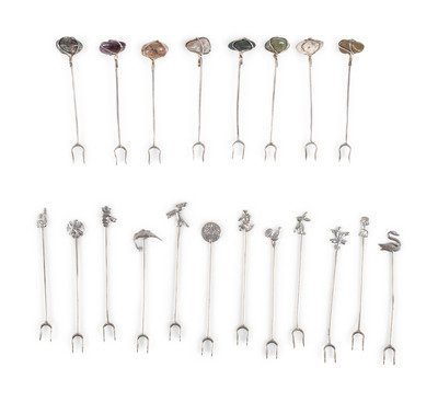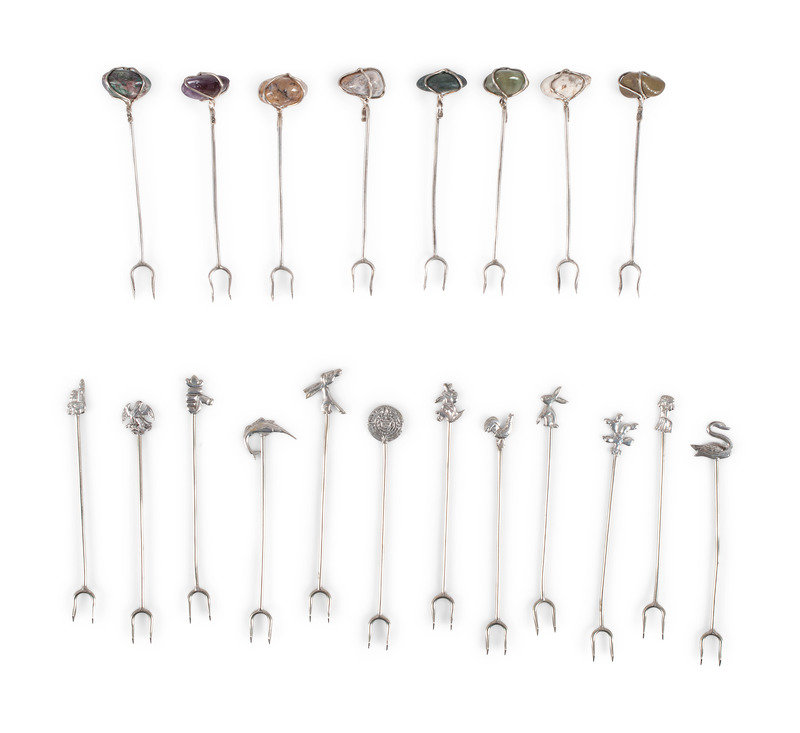 along with thirteen pieces of coin silver flatware by various makers, and 22 novelty picks.
