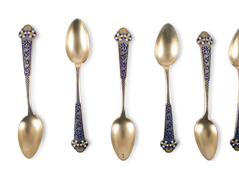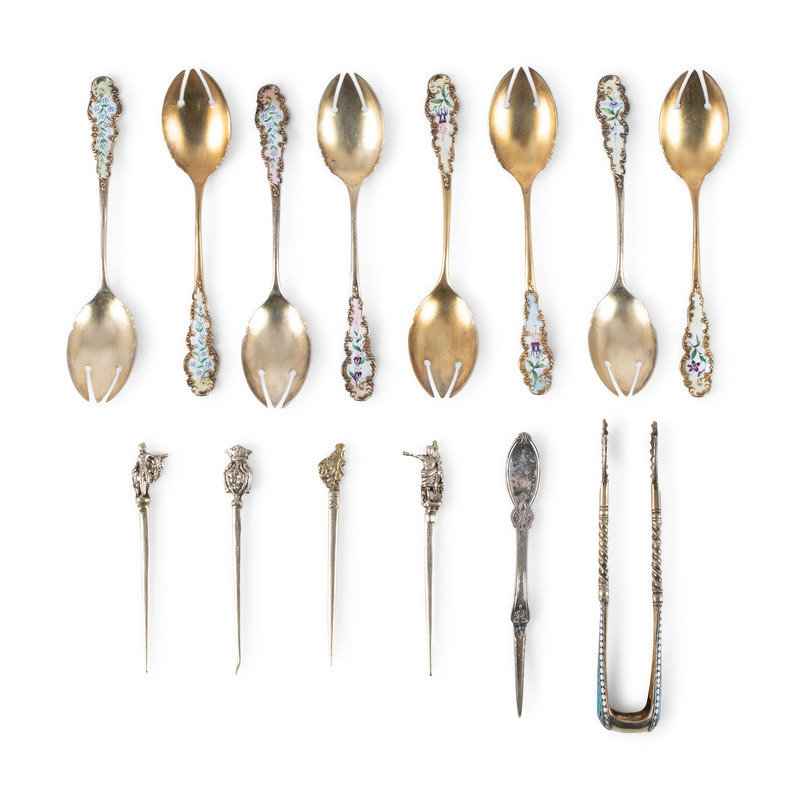 comprising eleven Gorham silver gilt and enameled demitasse spoons, twelve R. Blackinton & Co. silver gilt and enameled ice cream spoons, and seven enameled pieces by various makers.