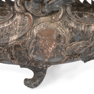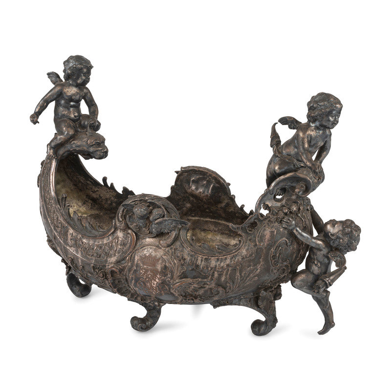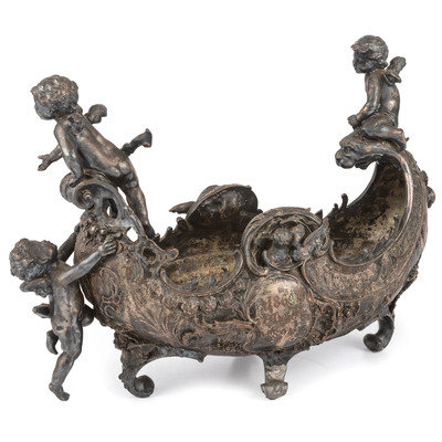 An Ornate Silverplate Centerpiece Bowl of Boat Form with Cherubs