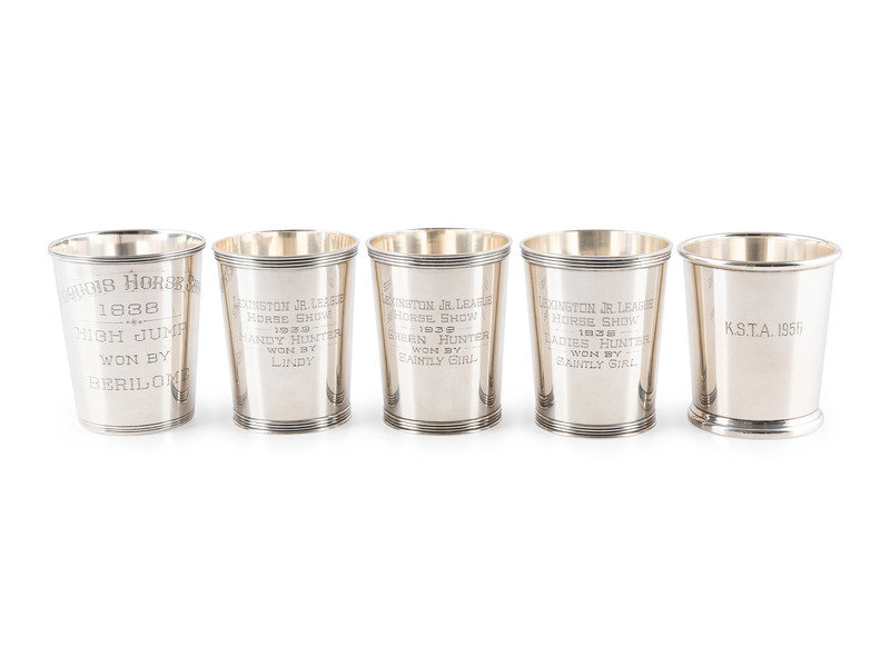 one by Balfour engraved Iroquois Horse Show / 1938 / High Jump / Won By / Berilome, one by Preisner initialed and dated 1956, and three by Manchester engraved for the Lexington Jr. League Horse Show, 1939.