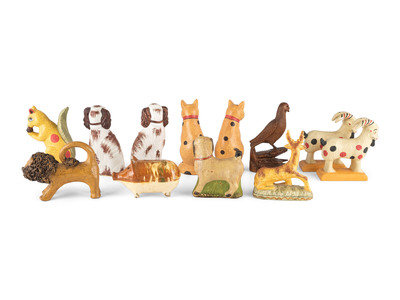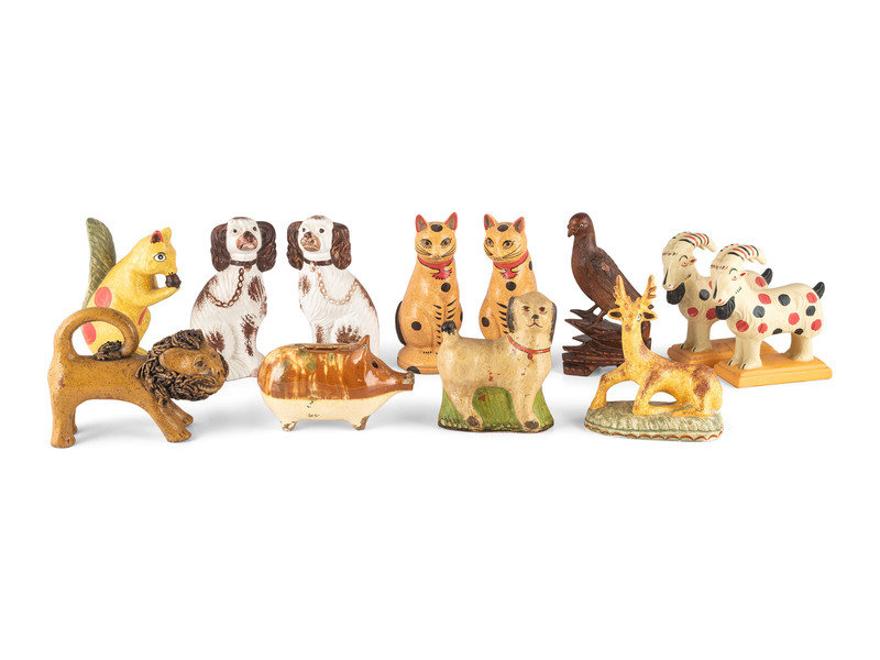 Twelve Contemporary Chalkware, Redware and Folk Carved Animal Figures