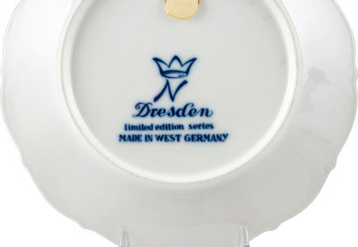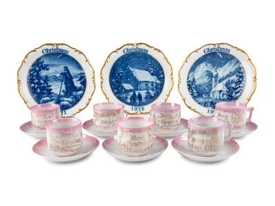 including a set of fourteen child's pink lusterware Merry Christmas teacups and saucers, with three Dresden Christmas plates.