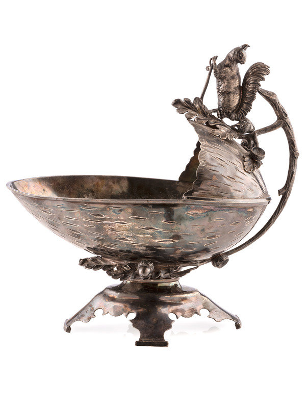 in the form of a squirrel seated atop a large nut, with molded acorns and leaves.