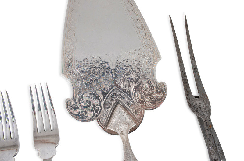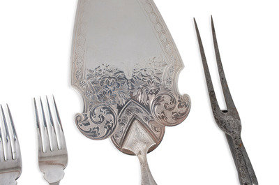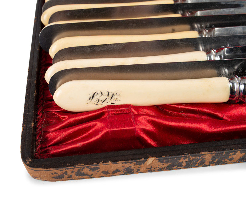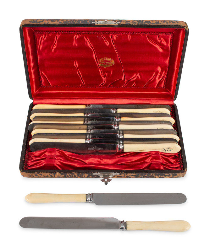 including a set of twelve Joseph Rogers & Sons knives, a set of twelve forks, a Roberts & Belk carving set, and seven silver-mounted pieces.