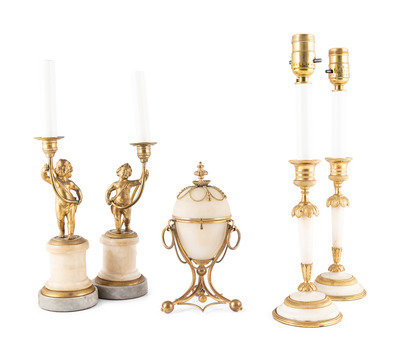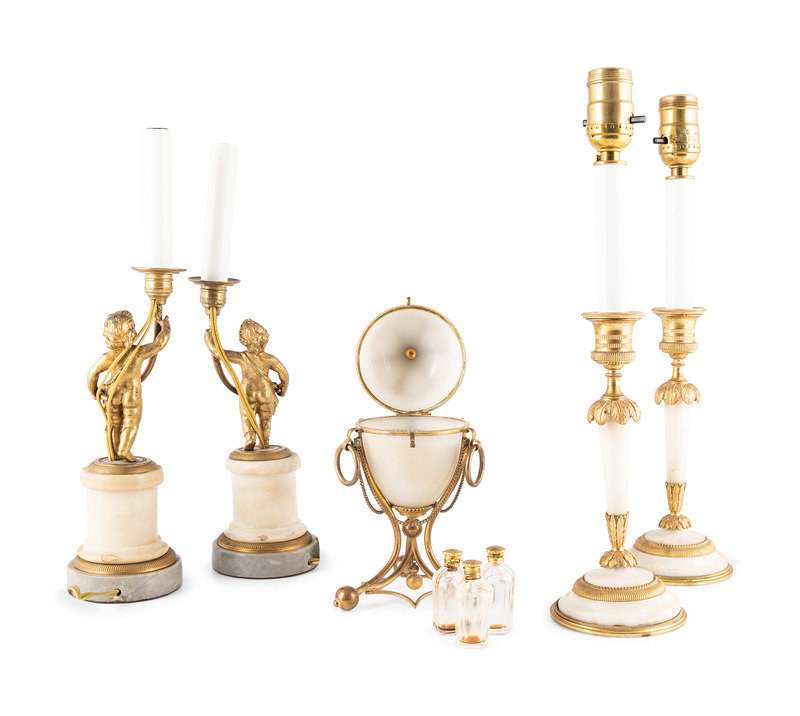 Four Gilt-Metal Mounted Candlesticks and an Opaline Glass Egg-Shaped Scent Casket