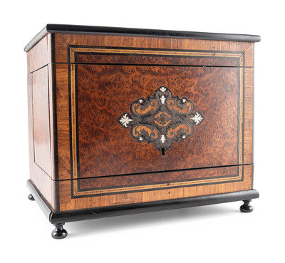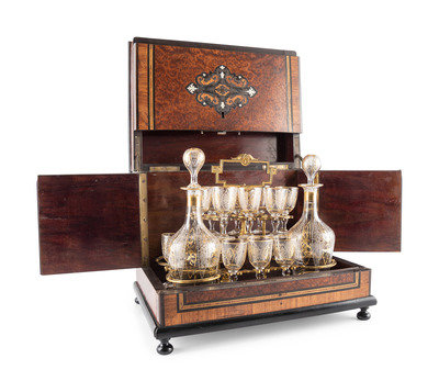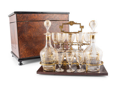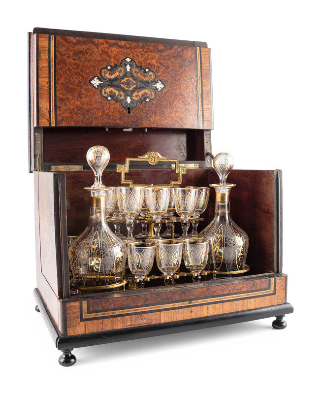 the interior fitted with removable caddy of gilt and etched glassware, likely a later addition.