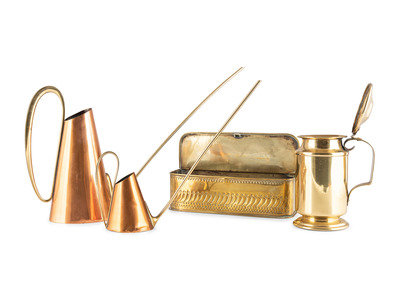 comprising an English brass tankard, an embossed brass hanging box, and two Werkstatte Hagenauer Wien copper and brass watering cans.