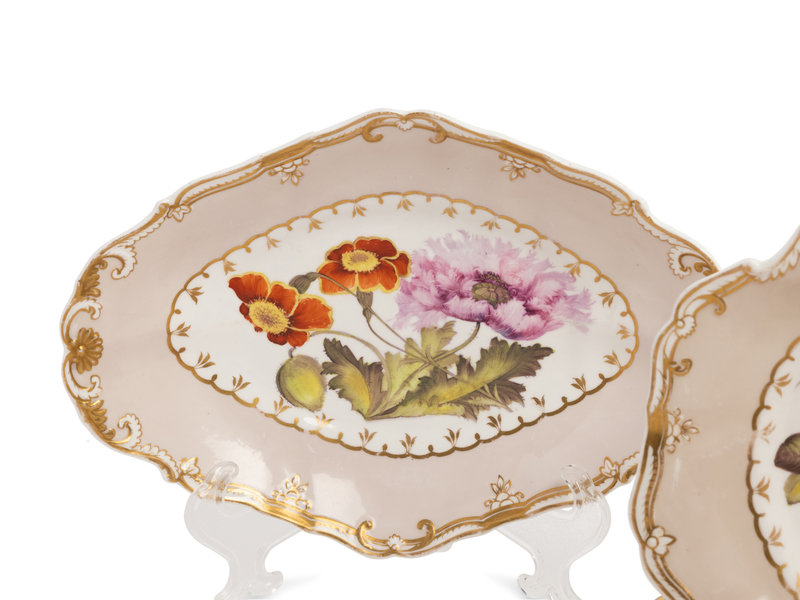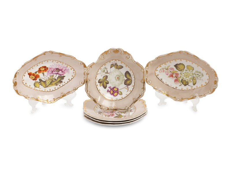 pattern no. 4373, comprising three dessert plates, two shaped oval dishes and a shaped circular dish; five of six examples marked Spode Felspar Porcelain to the underside, the sixth marked Spode 4373 in iron red to the underside, four examples numbered 4373 in iron red to the underside.