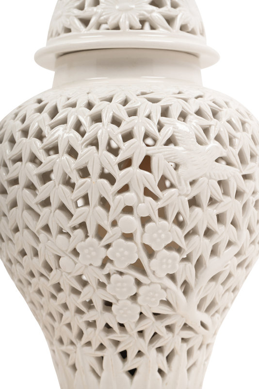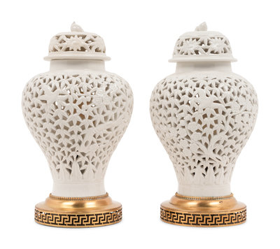 A Pair of White-Glazed Pierced Porcelain Jars Mounted as Lamps
