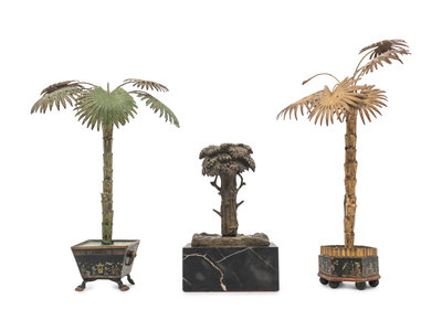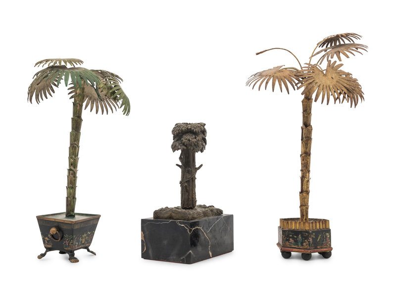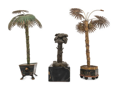 Two Cast Metal Models of Palm Trees and a Bronze Model of a Tree on a Marble Base
