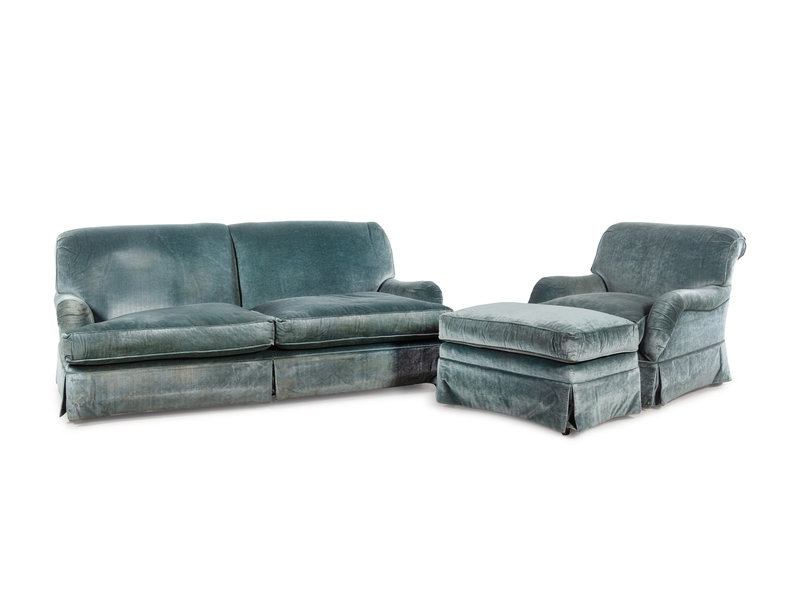 A Velvet-Upholstered Bridgewater Style Two-Seat Sofa, Easy Chair and Ottoman