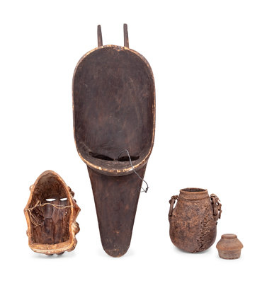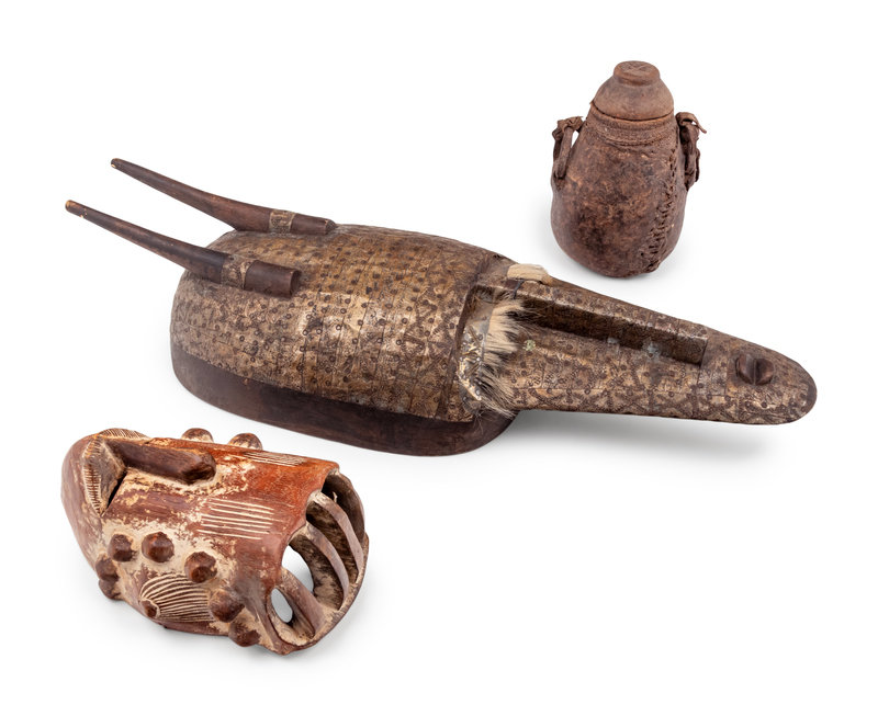 Two African Carved Wood Masks and a Covered Vessel