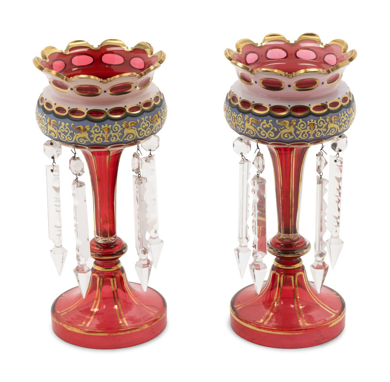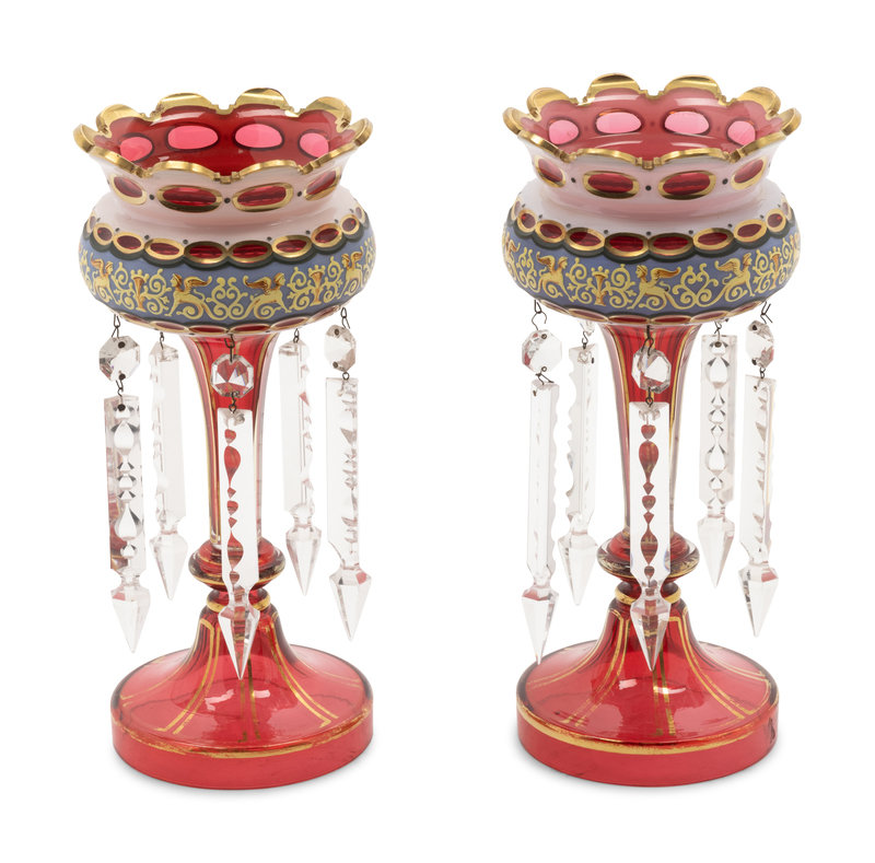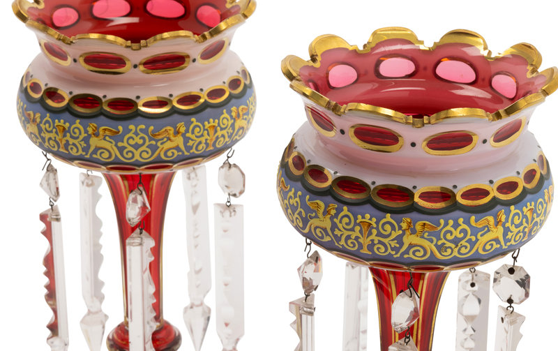 A Pair of Bohemian Enameled White Overlay Glass Lusters