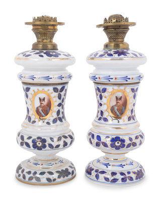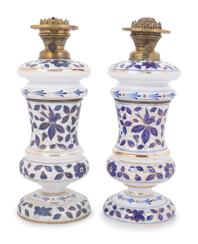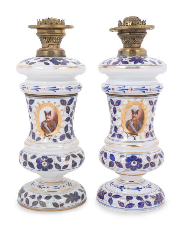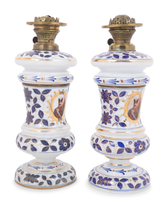 A Pair of Persian Market Opaline Glass Oil Lamps