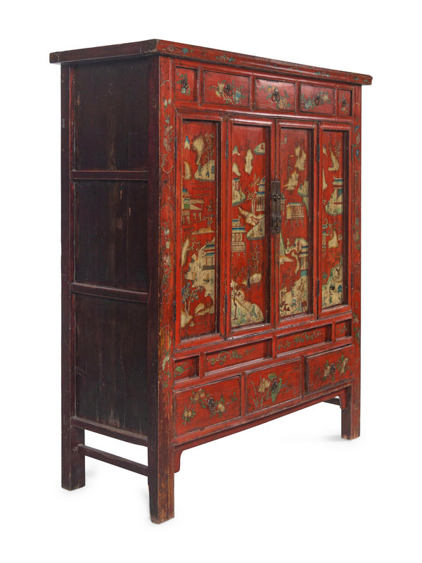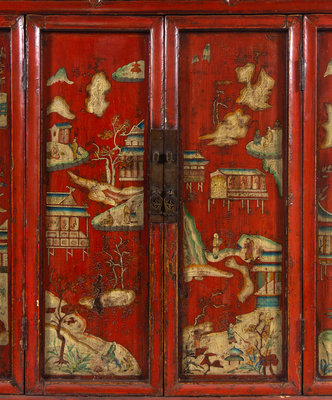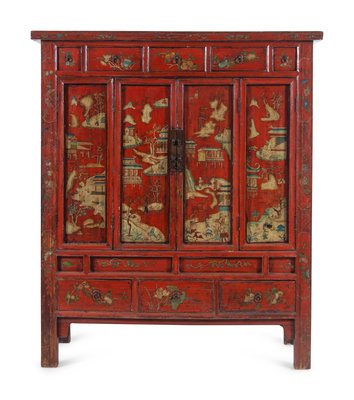 A Chinese Red Lacquered and Chinoiserie Decorated Armoire