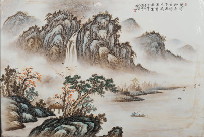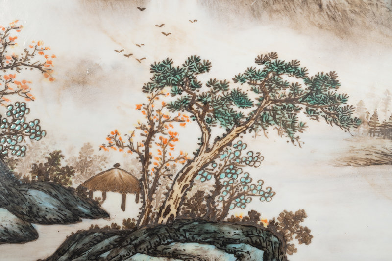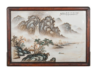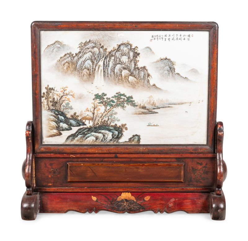 A Chinese Painted Porcelain Inset Carved Hardwood Table Screen