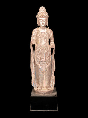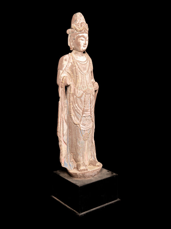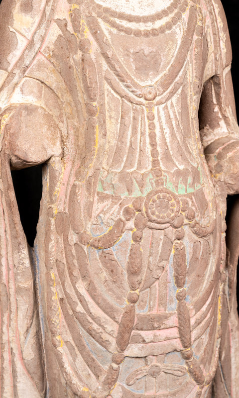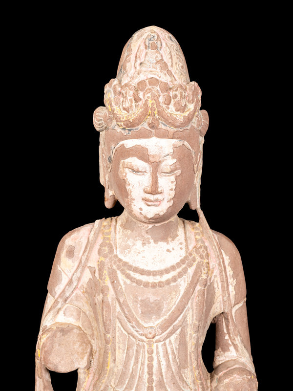 A Chinese Carved Sandstone Buddha with Remnants of Polychrome Decoration