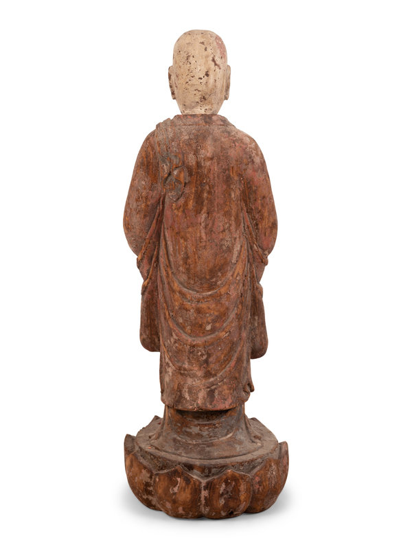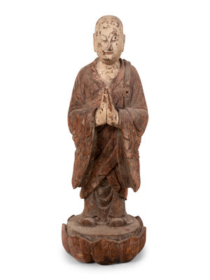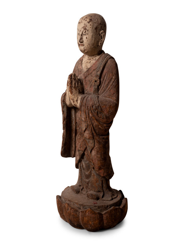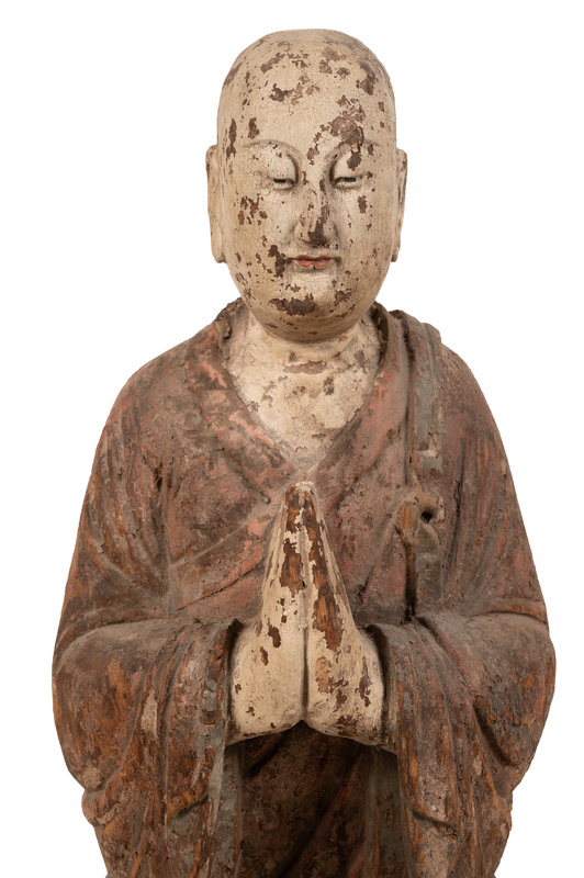 A Chinese Carved and Polychrome Decorated Wood Figure in Prayer