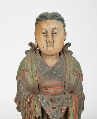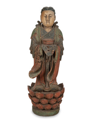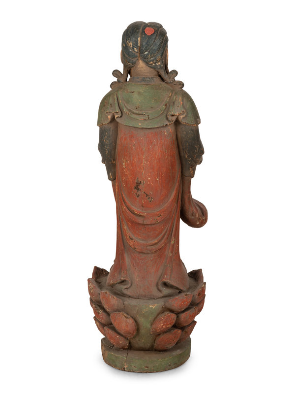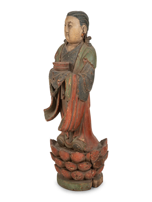 A Chinese Carved Wood Standing Figure with Polychrome Decoration