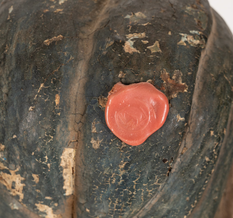 having a seal to the back of the figure's head.