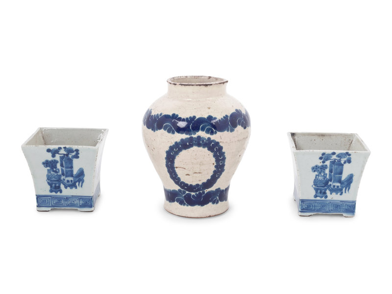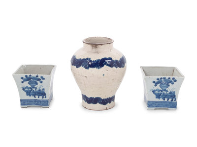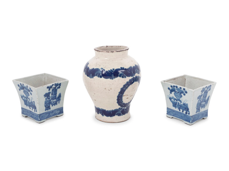 A Pair of Chinese Miniature Planters in Blue and White and a Blue and White Vase