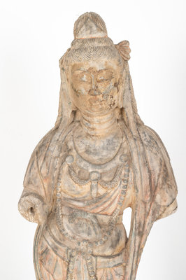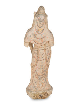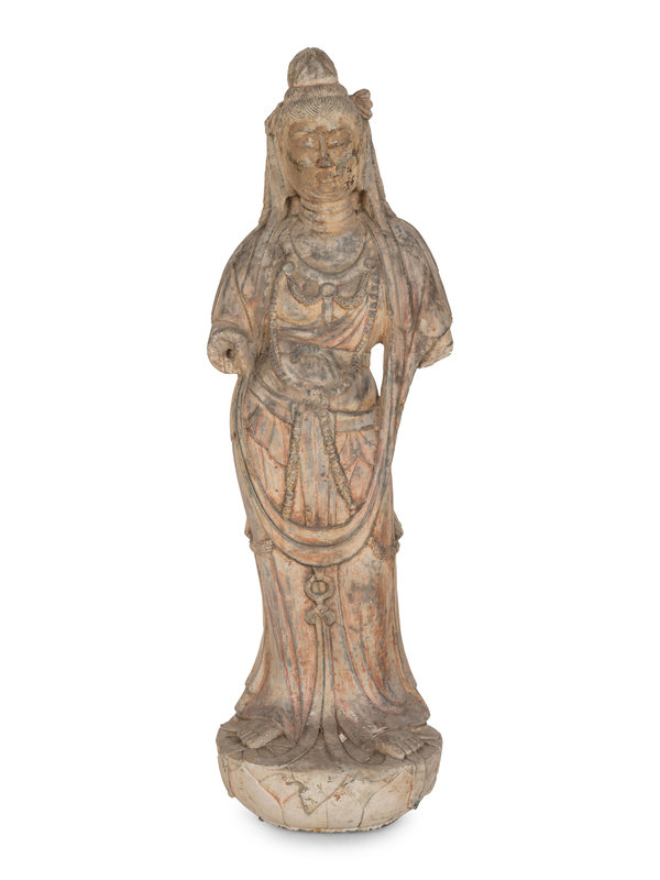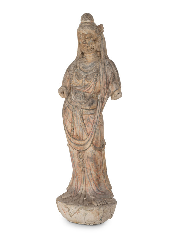 A Chinese Carved Stone Standing Guanyin Figure with Remnants of Polychrome Decoration