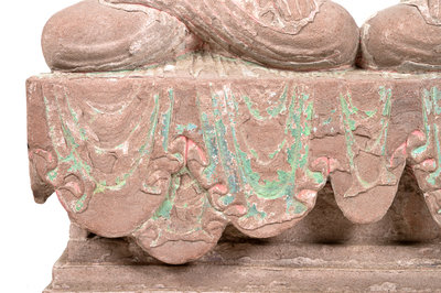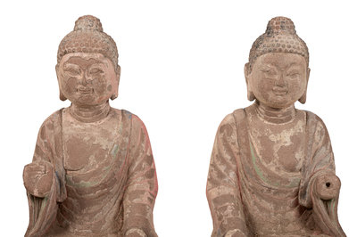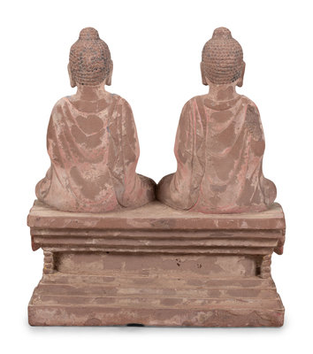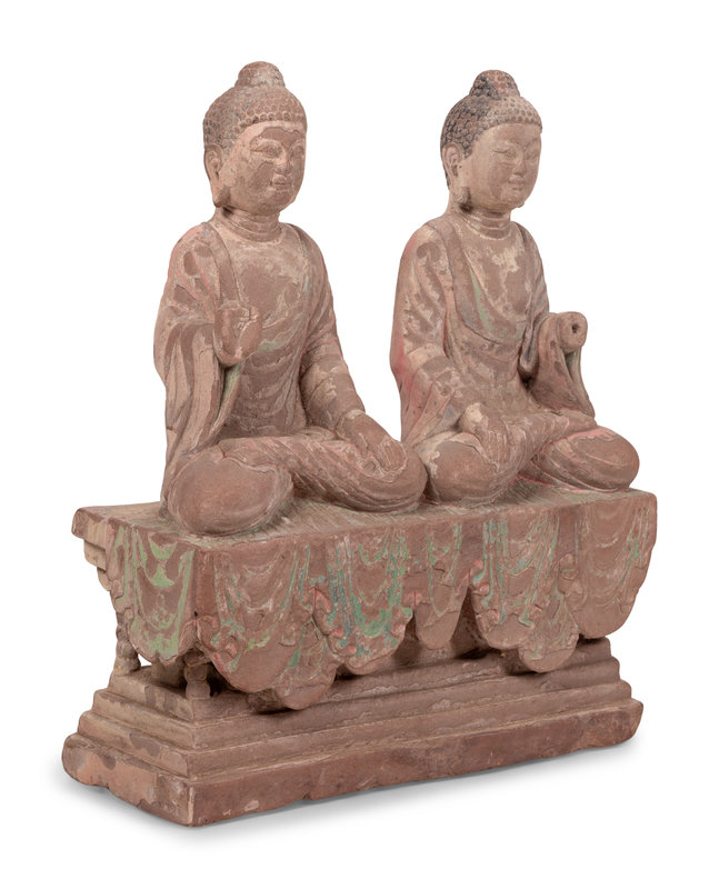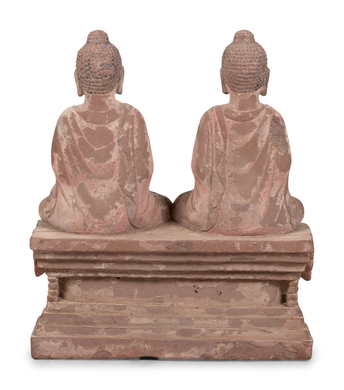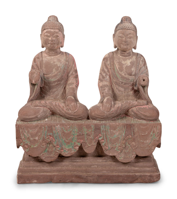 Two Chinese Carved Stone Seated Figures on a Rectangular Base with Remnants of Polychrome Decoration