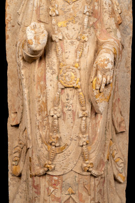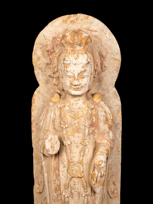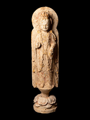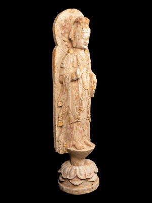 A Chinese Carved Stone Standing Buddha with Remnants of Gilt on Lotus-Form Base