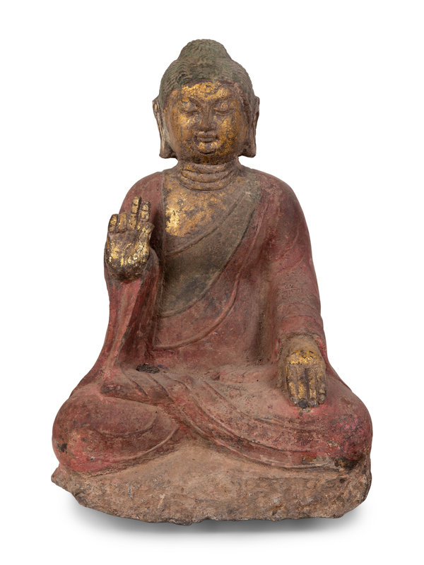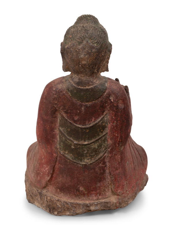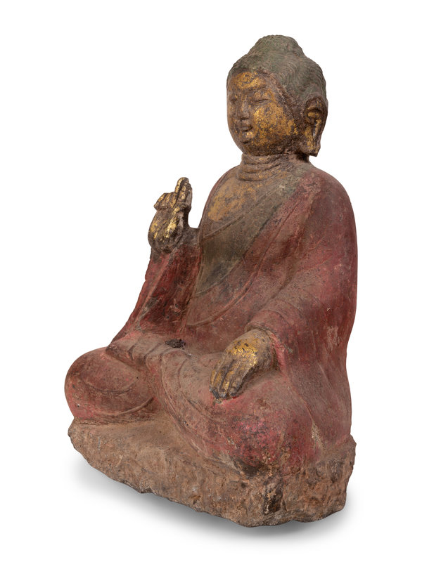 A Chinese Carved Stone Seated Buddha with Polychrome Decoration