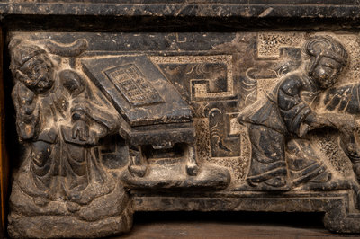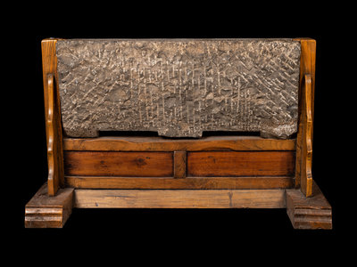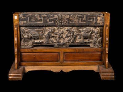 A Chinese Relief Carved Stone Stele Panel on Fitted Wood Stand