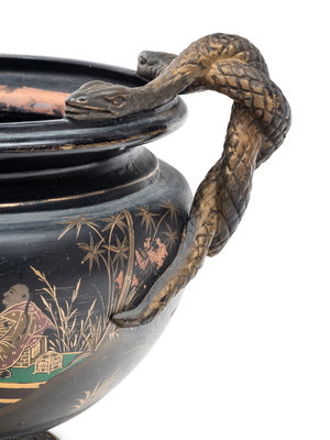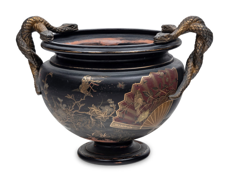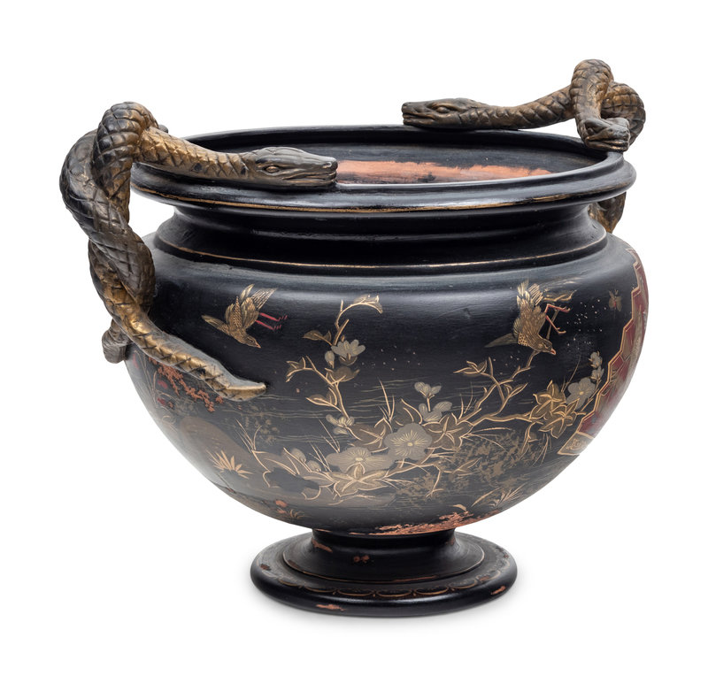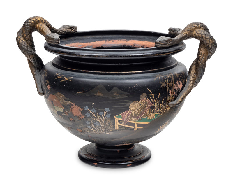 A Bronzed Terra Cotta Jardinière with Japanned Decoration