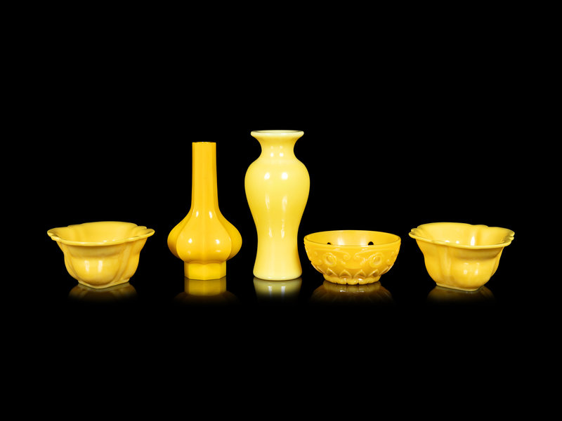 comprising an unusual pair of carved quatrefoil 'narcissus' bowls, each of opaque yellow tone and carved with petaloid details, raised above a diamond shaped foot; an opaque yellow bowl, pierced with four evenly spaced apertures and detailed scroll patterns above a lotus base, an opaque yellow faceted vase of octagonal form, and a semi-opaque meiping-form vase with a flat base and flaring neck, of lemon yellow tone.