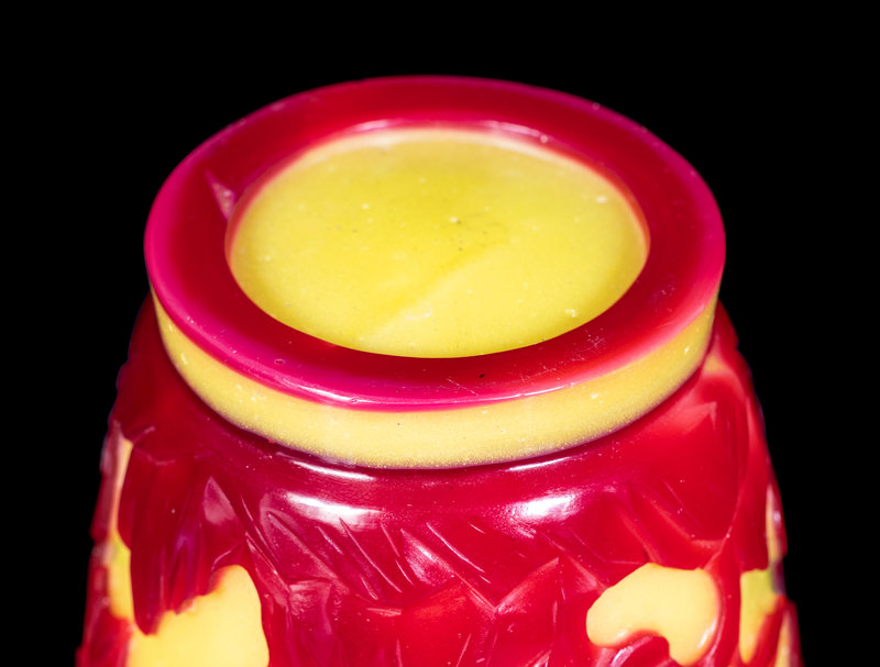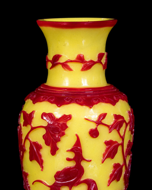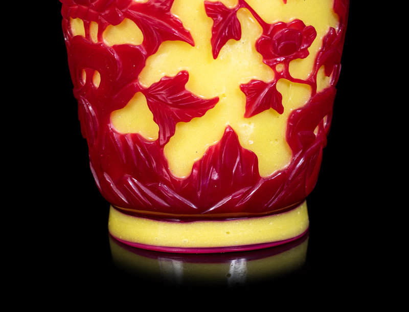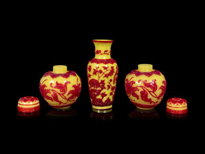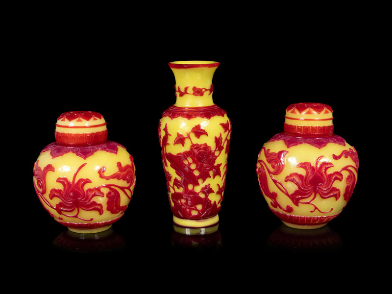 the vase having a cylindrical body, slightly waisted at the base, with rounded shoulders and a short neck, overlaid to the opaque ground with carved red glass phoenixes roosting among peony, with a band of prunus encircling the neck above ruyi lappets. The pair of jars worked in similar tones, the globular bodies carved with an overlay of large lotus flowerheads, the domed covers encircled with petal lappet bands.