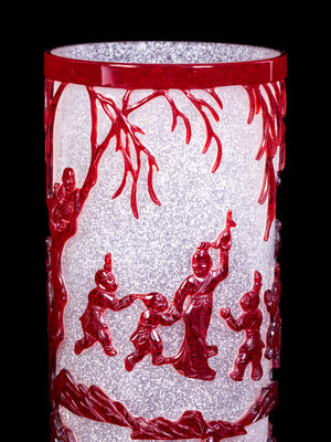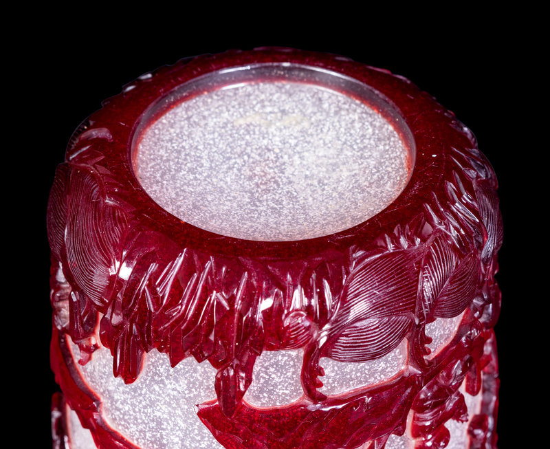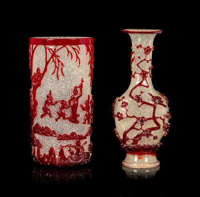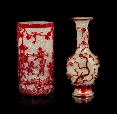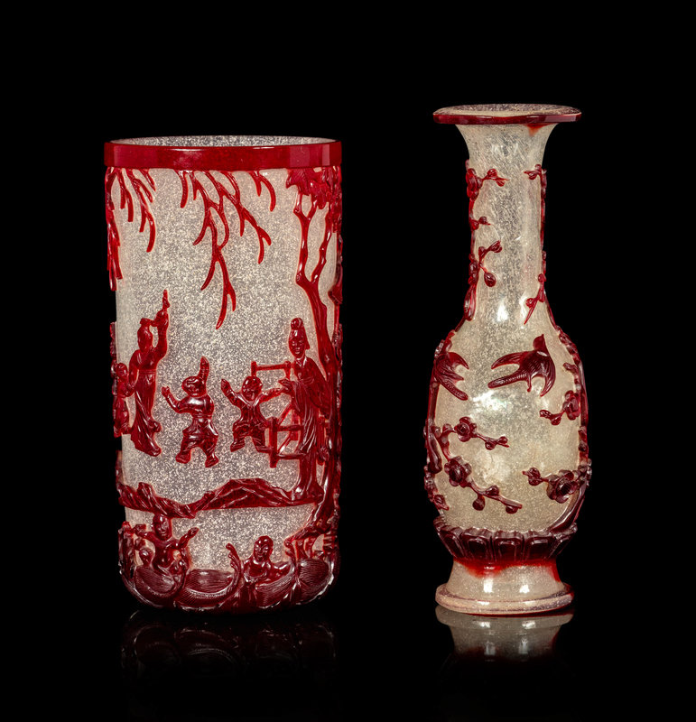 the first a cylindrical brushpot, the crystalline body decorated with a crimson overlay carved with a continuous scene of children at play in a landscape; the second a baluster vase having a compressed shield-form body risen above a splaying lipped foot, decorated with magpies perched in a network of prunus overlay of deep ruby red above a band of petal lappets.
